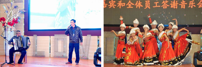 “2011年銷(xiāo)售突破億元(10656萬(wàn)元)”湯姆嘉賓和全體員工答謝音樂(lè )會(huì ),湯姆董事長(cháng)湯建華為湯姆員工芮正春演唱的《我的老婆并不美》作手風(fēng)琴伴奏(左圖);常州幼兒師范學(xué)校舞蹈隊為湯姆公司獻上民族舞《唐古拉》(右圖)