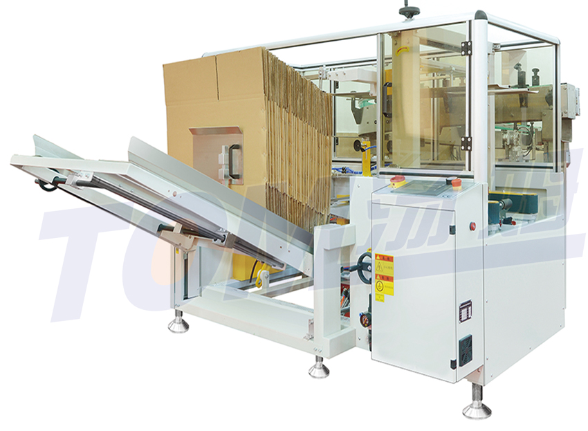 自動(dòng)完成開(kāi)箱、成形、下底折葉折曲。并實(shí)同時(shí)完成下部分膠帶黏貼, 將疊成紙板的箱板自動(dòng)打開(kāi),箱子底部按一定程序折合,并用膠帶密封后輸送裝箱機的專(zhuān)用設備。自動(dòng)開(kāi)箱機是大批量紙箱自動(dòng)開(kāi)箱、自動(dòng)折合下蓋、自動(dòng)密封下底膠帶的流水線(xiàn)設備,本機采用PLC顯示屏控制,大大方便操作、管理、減少生產(chǎn)人員和勞動(dòng)強度,是自動(dòng)化規模生產(chǎn)必不可少的設備。操作方便,降低包裝成本。 可配熱熔膠機封箱。